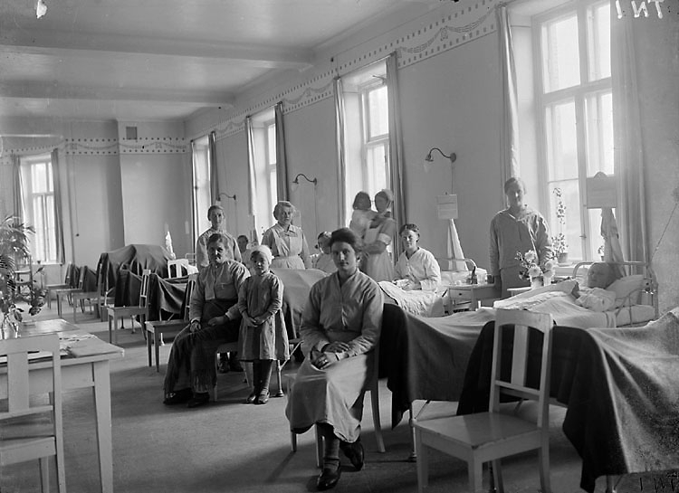 Enligt senare noteringar; "Interiör från sjuksal i Uddevalla lasarett, patienter och sjuksköterskor."