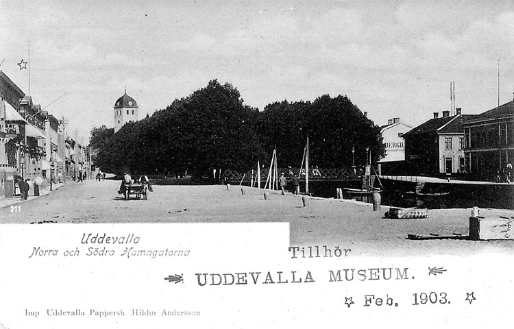 Tryckt text på vykortets framsida: "Uddevalla Norra och Södra Hamngatan".