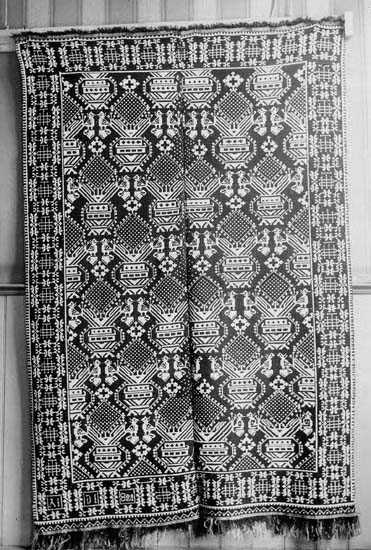 "Krukor och fåglar" brukade detta finnvävstäckes mönster kallas. "Ödsmål Inlands No [norra] Göteborg och Bohuslän" text på kortets baksida.