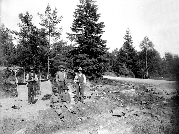 Enligt noteringar: "Vägbygge någonstans i Foss. Fem vägarbetare med redskap.