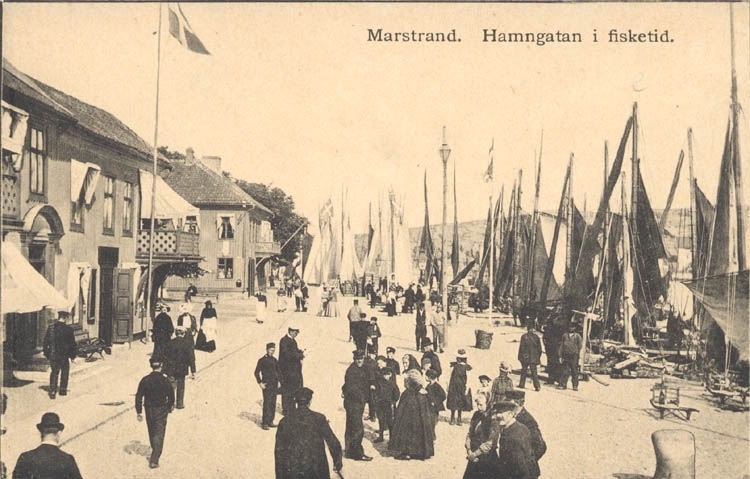 Tryckt text på kortet: "Marstrand. Hamngatan i fisketid."