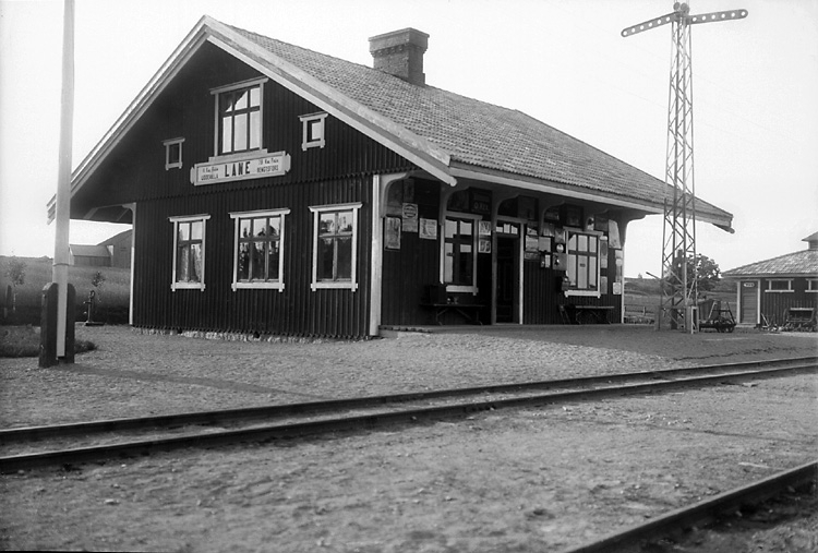 Enligt tidigare notering: "Lane järnvägsstation på Lelångebanan. Framför byggnaden semafor."