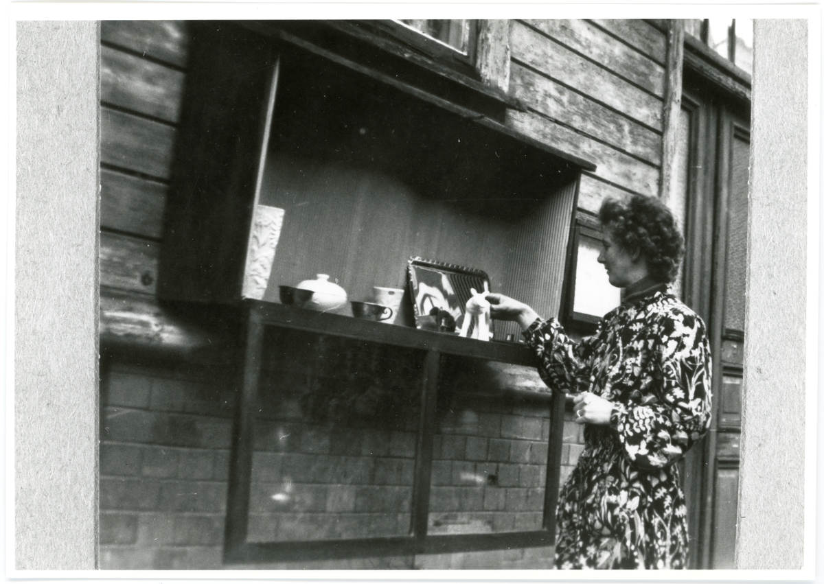 Inga Carlström skyltar om i skåpet på Hemslöjden, Lagerbergsgatan, Uddevalla