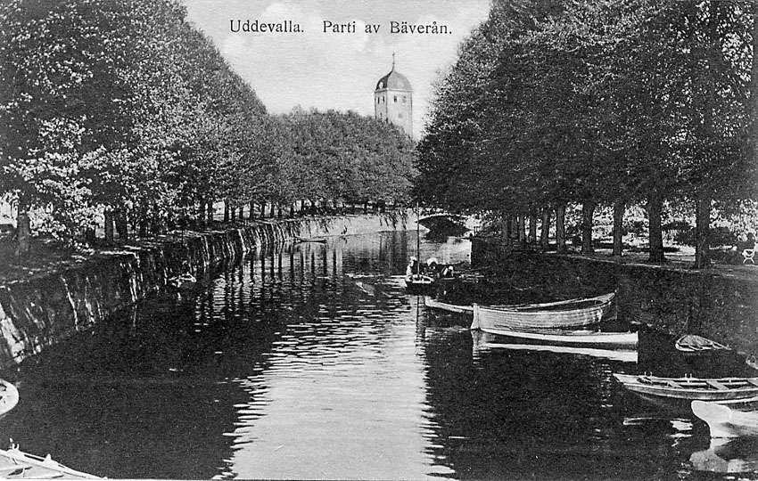 Tryckt text på vykortets framsida "Uddevalla Parti av Bäverån".