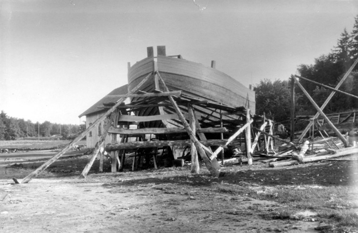Skrivet på vidhängande papper: Kombination av skal- och skelettbyggnad. Undervattensskrovet klinkbyggt. Ovanvattensskrovet kravellbordlagt på spant. Galeasbygge på Anders Mattssons varv i Kongsviken, Bohuslän, 1938.