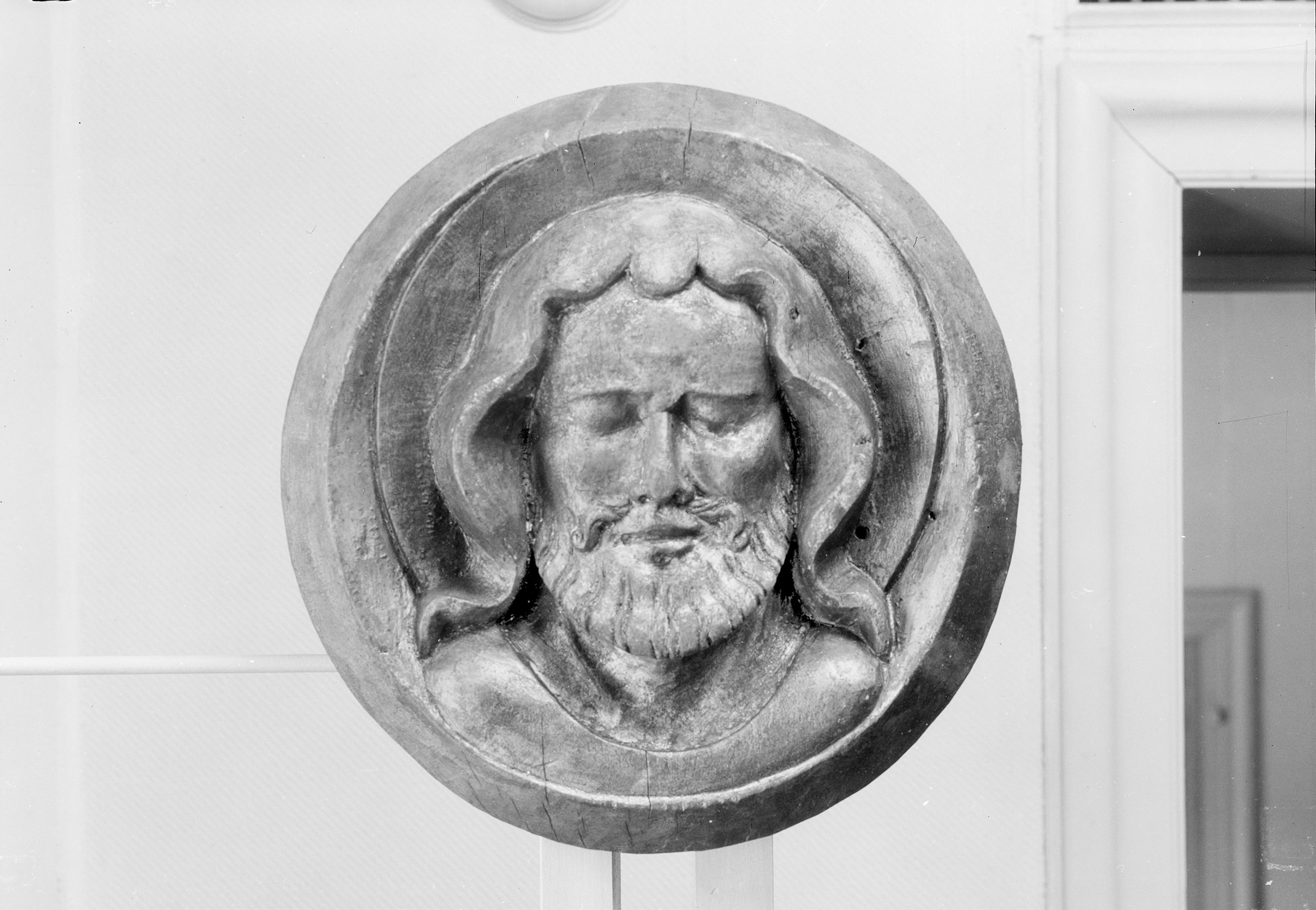 Slutstensplatta av skulpterad ek föreställande manligt helgon.