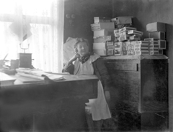 Enligt notering: "Affärsinteriör, kvinna i telefon".