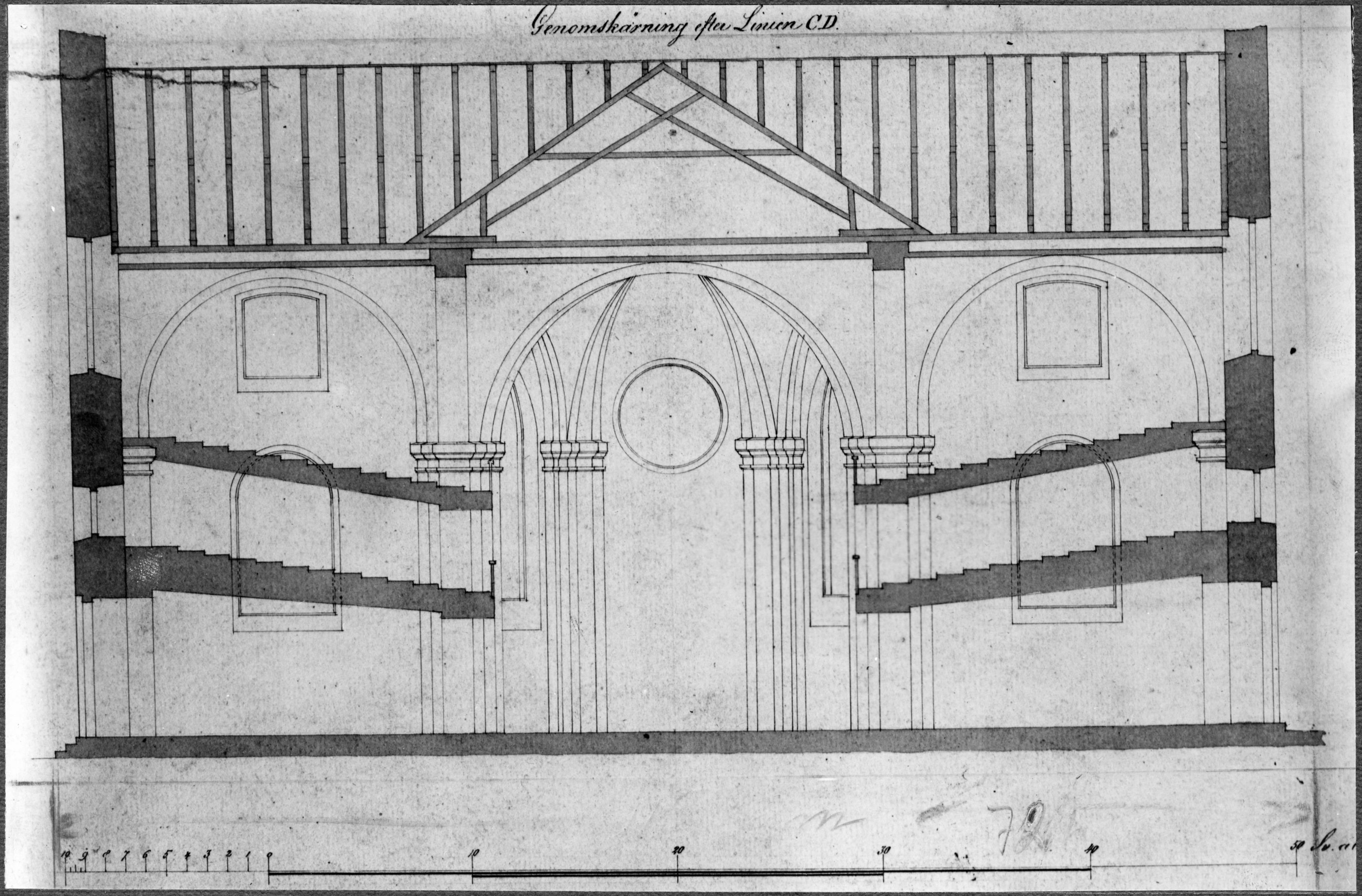 Ritning av tvärsektion mot öster utförd 1848 av J. P. Lindberg. Avfotograferad.