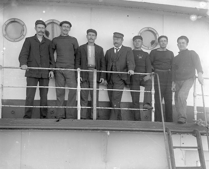 Fotografens notering: "Bli inte rädd för mig, jag var ej hälften så arg som jag syns vara, längst till höger står en Dansk. och det är Tredje styrman i midten".