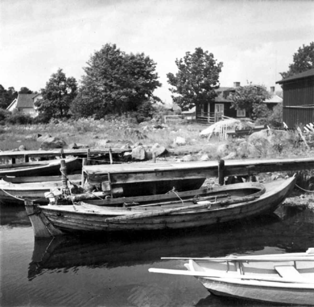 Skrivet på vidlimat papper: Lotsförman Holmströms båt vid lotsbryggan i Påskallavik. Båten byggdes med raka av båtbyggare Jonsson på Veckholm, Mönsterås. Ombygd och försedd med akterstäv 1908 eller 1909 av fyrvacktare Bäckström på Dämman. Motor, 3* hkr, insatt 1917, däck och skvättbord 1926. Foto Hasslöf 1951.