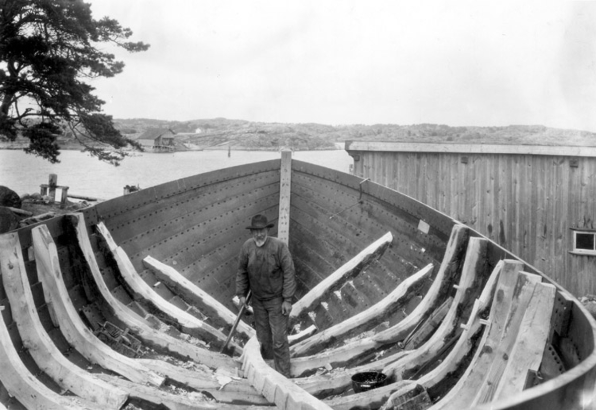 Skrivet på vidhängande papper: 4-de stediet. Båtbyggare Stjärn på Galtö, Bohuslän, hugger till och lägger in intimmren, förr kallade bred, vränger, numera spant.