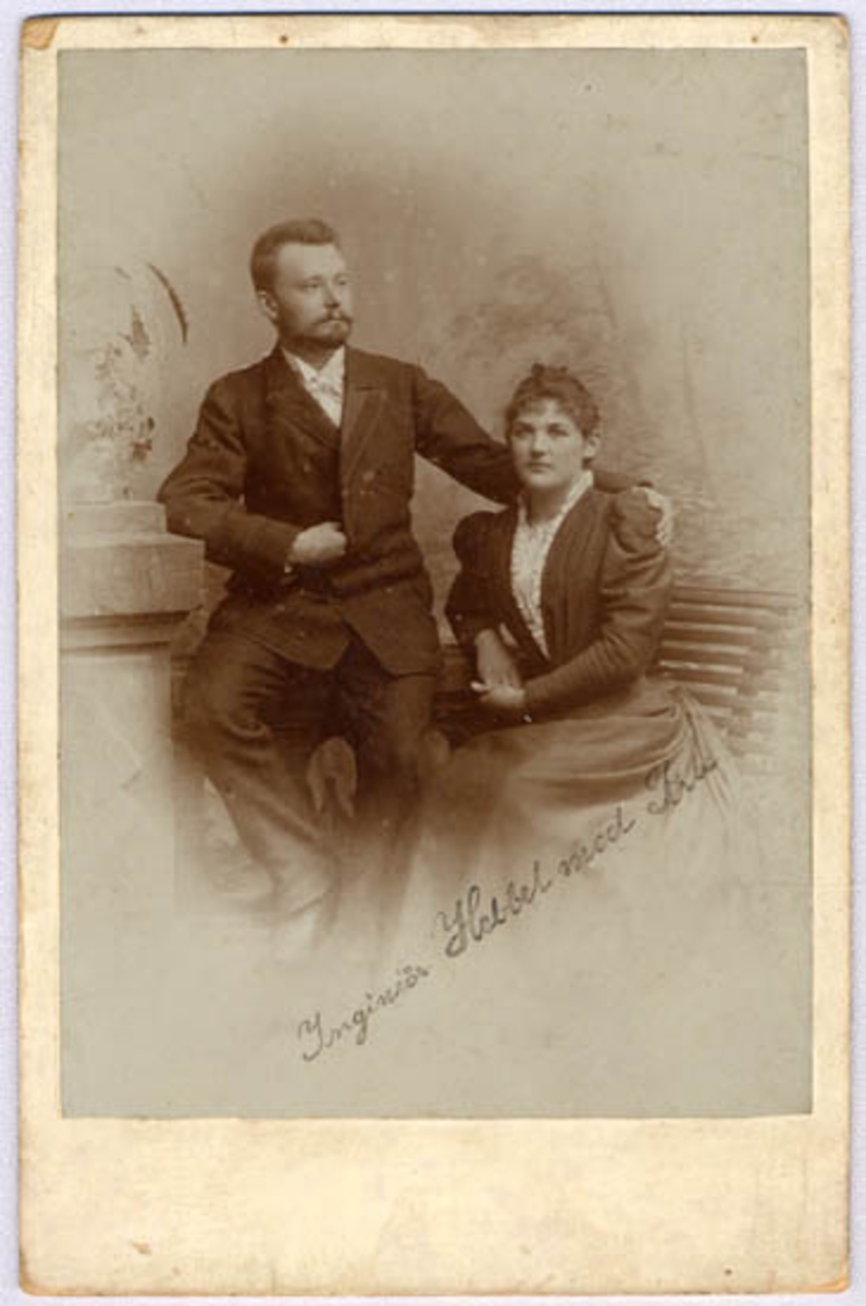 "Ingeniör Hebbel med fru. Hebbel var anställd hos "Kullgrens änka" som ritare och arkitekt, var tysk till börden också hans fru. Kortet är från 1890 - 1900