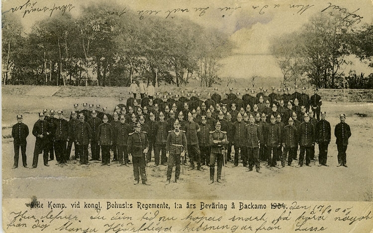 Enligt Bengt Lundins noteringar: "9:de kompaniet vid kongl. Bohusläns Regemente, 1:a års beväring å Backamo 1904".