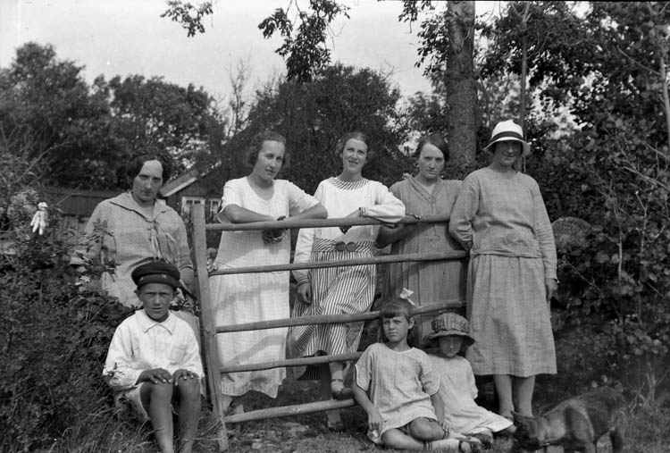 Enligt medföljande text: "Grupp damer o barn vid grind".
