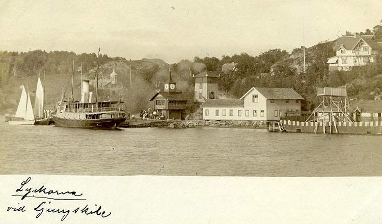 Enligt Bengt Lundins noteringar: "Lyckorna vid Ljungskile. SS Kung Rane med segelbåtar vid ångbåtsbryggan".