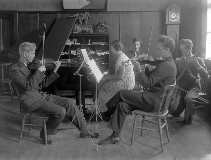 Text till bilden:"Orkester består av en dam på flygel, Herrarna spelar fiol, basfiol och klarinett. V. U. skolan 1933-34".