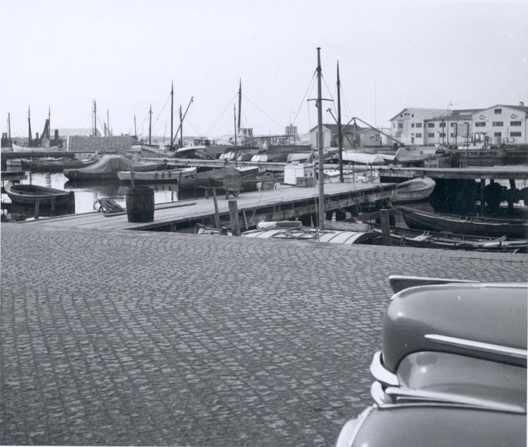 Noterat på kortet: "Gravarne G. hamnen ca. 1950. Till h. i bakgrunden AB Bröderna Amelns konservfabrik på Rösholmen".