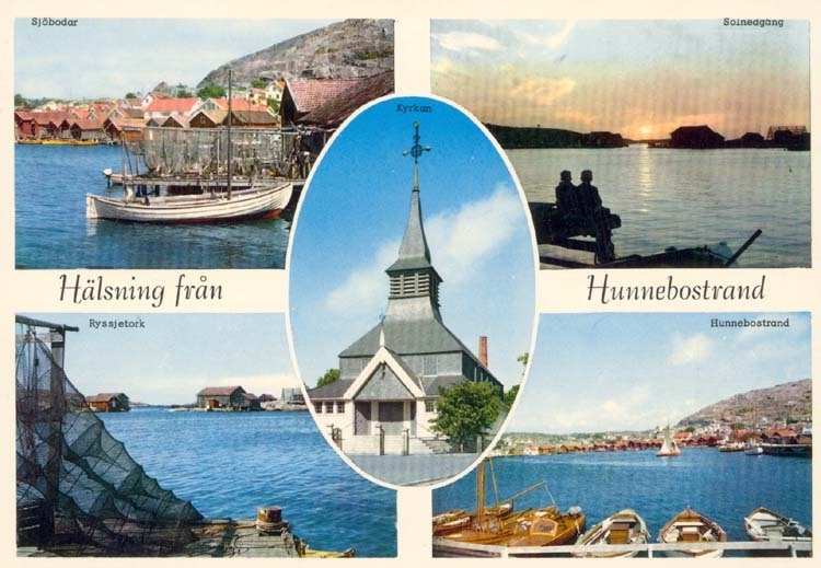 "Sjöbodar, Solnedgång, Ryssjetork, Hunnebostrand, Kyrka."
