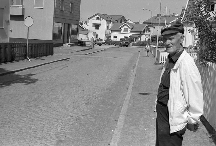 Enligt fotografens notering: "Eric Gunnarsson, Lysekils siste stenhuggare står på stora Kyrkogatan som han själv lagt med smågatsten (knott). Nu skall gatan istället få asfalt".