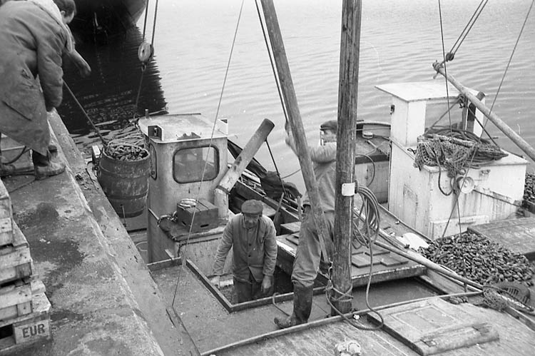 Enligt fotografens notering: "Blåmusslefiske, lossning i Lysekil 1968".