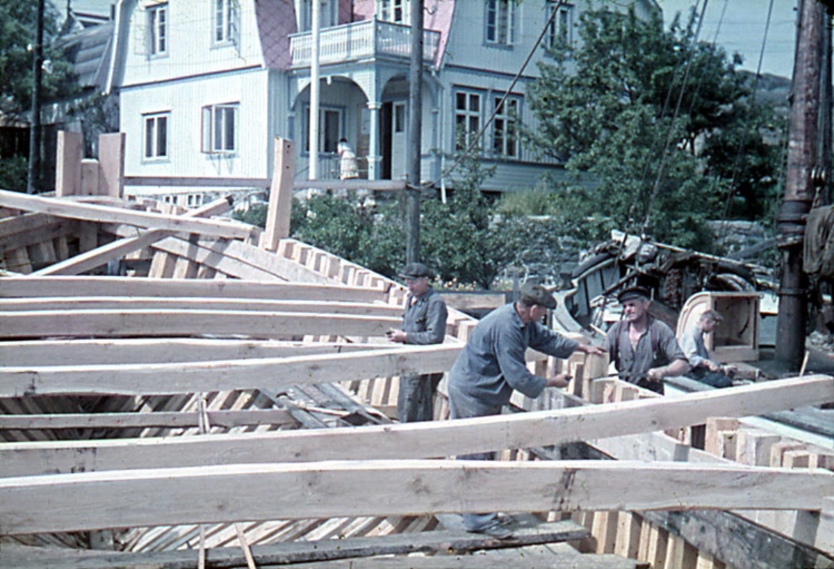 Bergs varv. Nybygge av fiskebåt på Bergs varv. Inpassning av däcksbalkar. Oskar Olofsson, Mauritz Johansson och Oskar Karlsson. Direktör J.W. Bergs villa i bakgrunden.