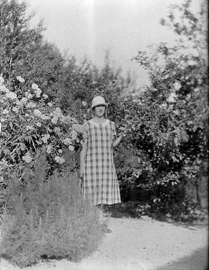 En kvinna, syster till fotografen, i rutig klänning och hatt poserar i trädgården på Rultane, Hedekas, vid en blomrabatt med bland annat rudbeckia (gullboll), åbrodd och till höger en buske av något slag.