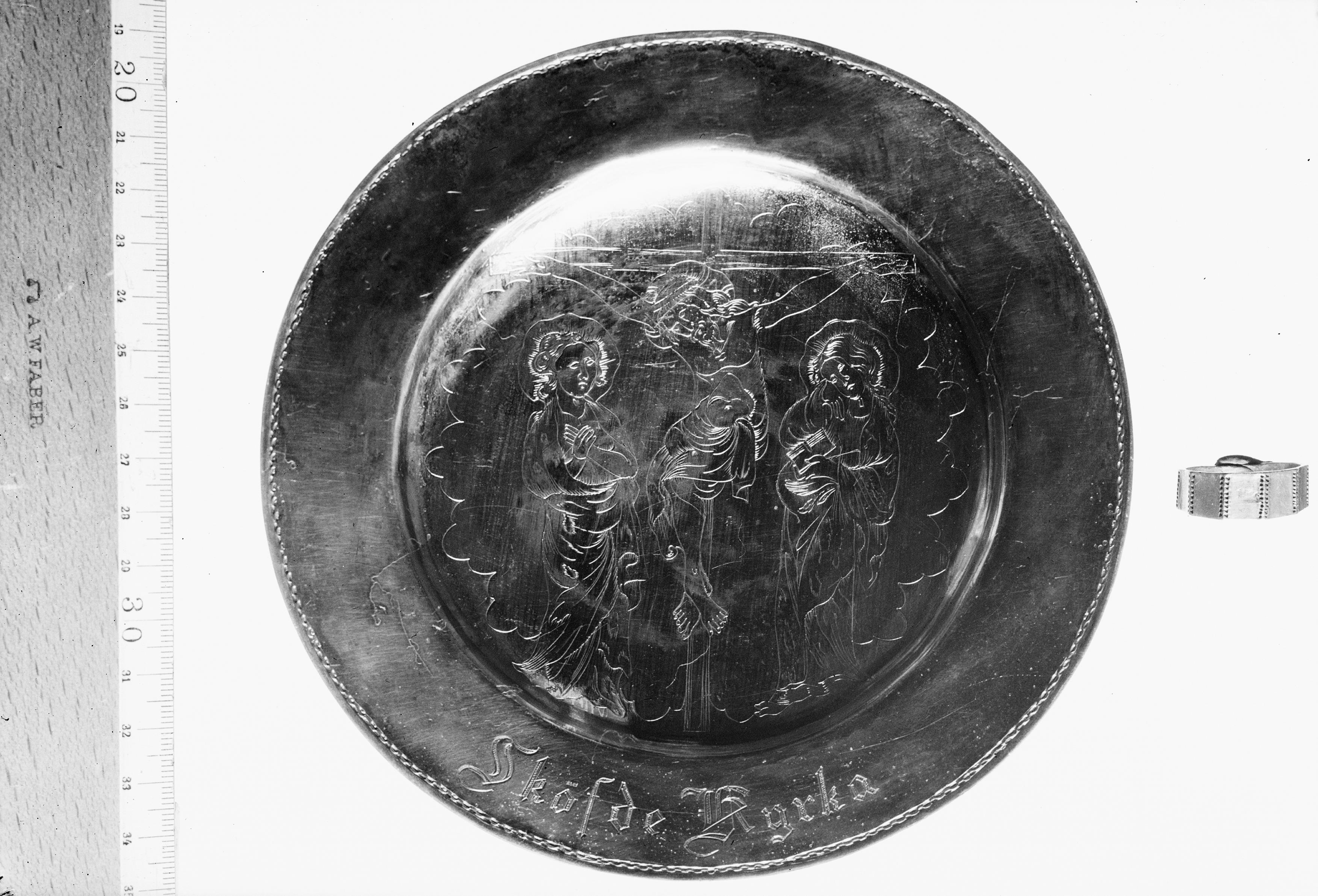 Patén, förgyllt silver, bottengravyr med kalvariegrupp, utförd av Andreas Wibeck, Borås, första hälften av 1700-talet.