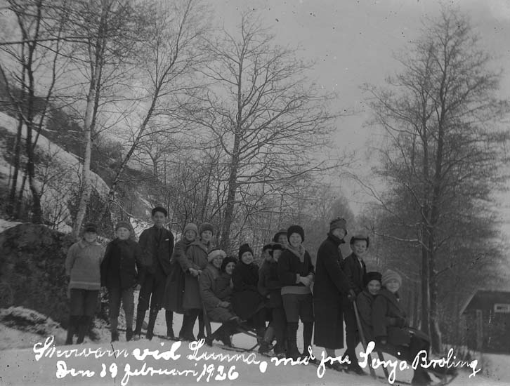 Skrivet på bilden: "Skolbarn vid Lunna med fru Sonja Broling. Den 19 februari 1926."