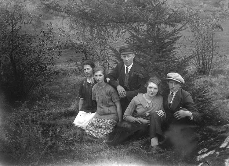 Enligt notering: "Två män, tre kvinnor i skogen, Hulda o Märta Sundell ?, ?, ?".