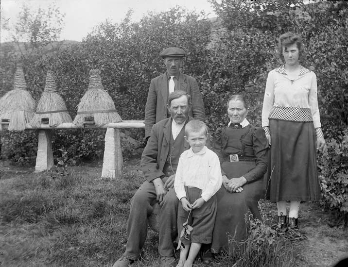 "Vid bikupor". En familj har radat upp sig framför de välgjorda bikuporna av halm. Troligen 1930-talet.