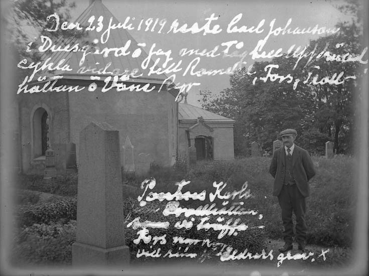 Enligt text på fotot: "Den 23 juli 1919 reste Carl Johansson i Duesgård o jag med Tåg till Upphärad, cykla vidare till Romeled, Fors, Trollhättan o Väne Ryr. Pontus Karlsson från Trollhättan. som vi träffa Ryrs kyrkogård vid sina föräldrars grav".
