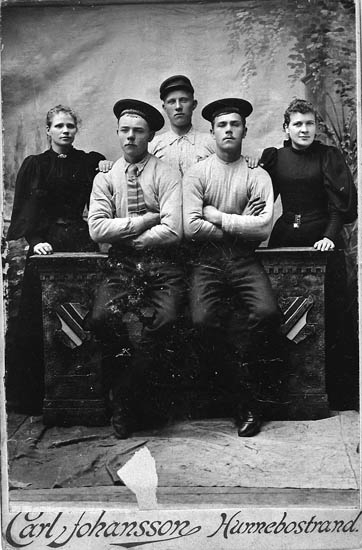 Enl. tidigare noteringar: "Ateljefoto av tre män och två kvinnor på Carl Johanssons atelje. Hunnebostrand.
