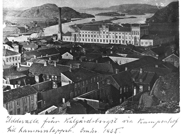 Text på kortet: "Uddevalla från Kålgårdsberget via Kampenhof till hamninloppet, omkr. 1865".