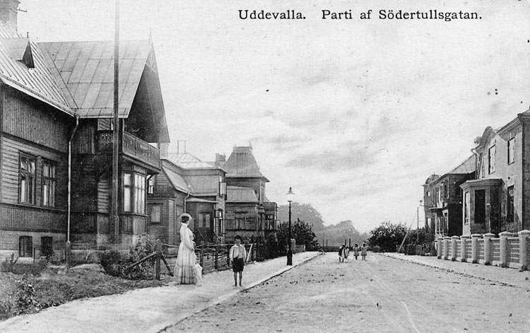 Tryckt text på vykortets framsida: "Uddevalla. Parti af Södertullsgatan".