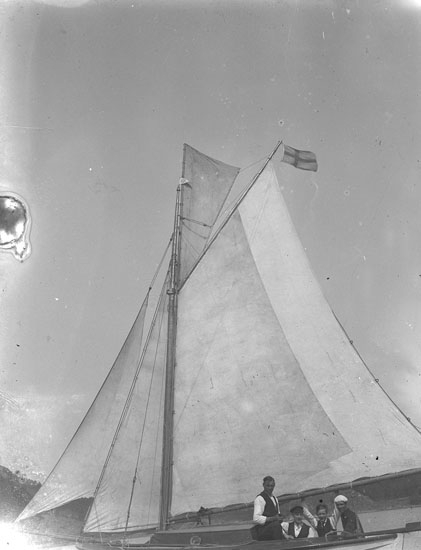 Enl. text i blå bok: "Personer i sittbrunnen på en segelbåt."