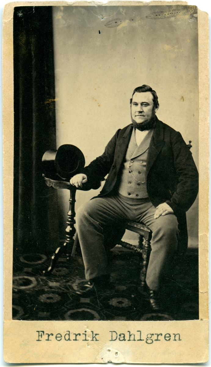 Text på kortets baksida: "Bokbinderimästaren Fredrik Dahlgren, F. 25/3 1824 d. 26/9 1/876".