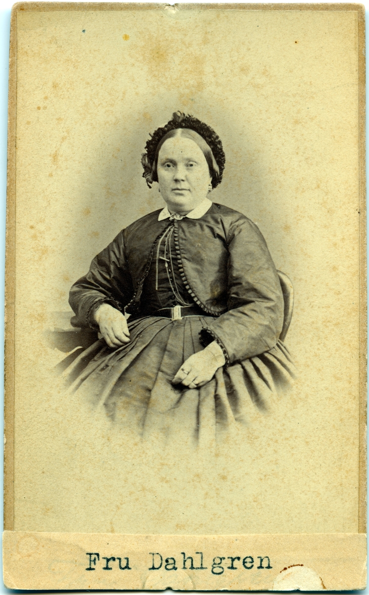 Text på kortets baksida: "Fru Dahlgren, syster till Petterson i Backen. Gift med Bokbindaren Fredrik Dahlgren".
