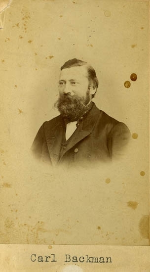 Text på kortets baksida: "Carl Bachman. Resande för Kampenhofs Bolag. Sedan bosatt i Årjeng, död där. Barnhusgosse, född 1818, fadern snickare i Uddevalla".