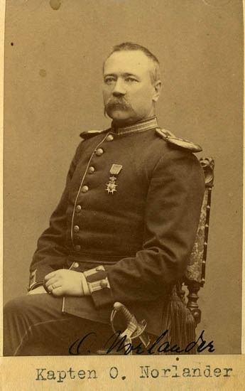 Text på kortets baksida: "Oscar Fredik Norlander, f, 1842. Kapten och manskapschef Boh. reg.".