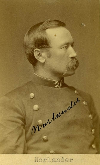 Text på kortets baksida: "Kapten Oscar Fredik Norlander, f, 1842. Här Löjtn. Boh. reg.".
