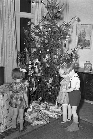 Tre förväntansfulla barn väntar på julklappsutdelning, december 1949