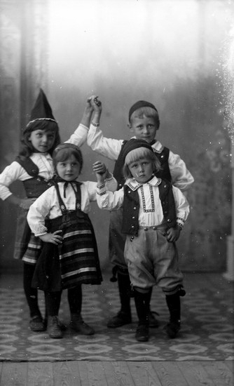 Fyra barn står parvis uppställda iklädda folkdräkter, flickorna har Rättviksdräkter