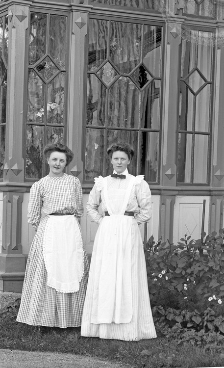 Två kvinnor nedanför en glasveranda, till höger står Hilma Eliasson