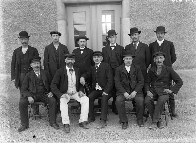 Enligt tidigare noteringar: "Gruppfoto av arbetare utanför verkstadsbyggnad vid Bohusläns regemente."