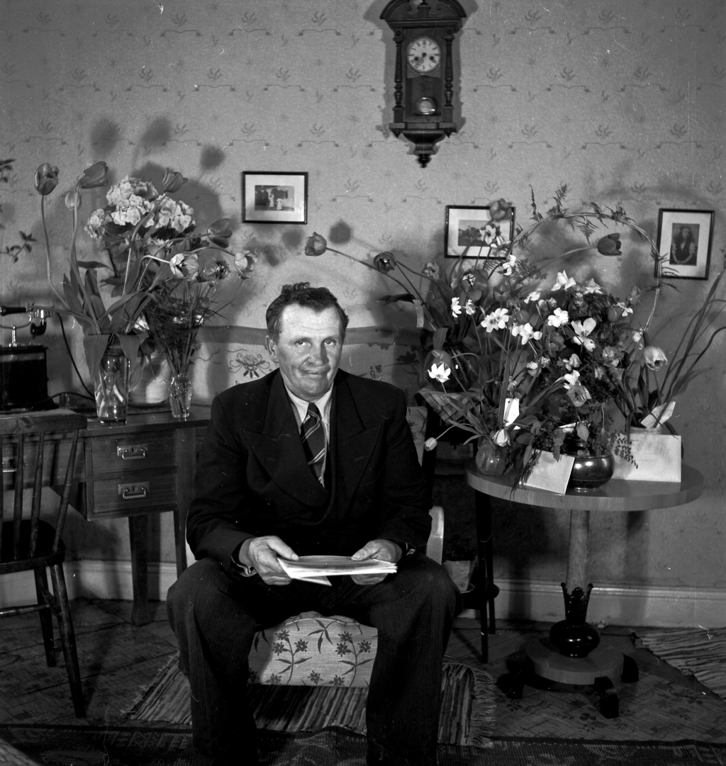 Man sittandes vid blomsterbord.