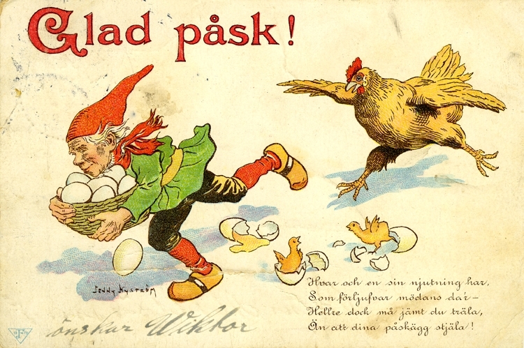 "Glad Påsk. Hvar och en sin njutning har. Som förljufvar mödans dar. Hellre dock må jämt du träla. Än att dina påskägg stjäla."
