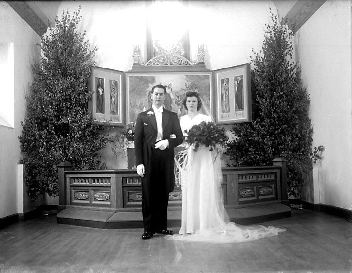 Enligt senare noteringar: "Brudpar framför altaret i kapellet, Munkedal." (BJ)