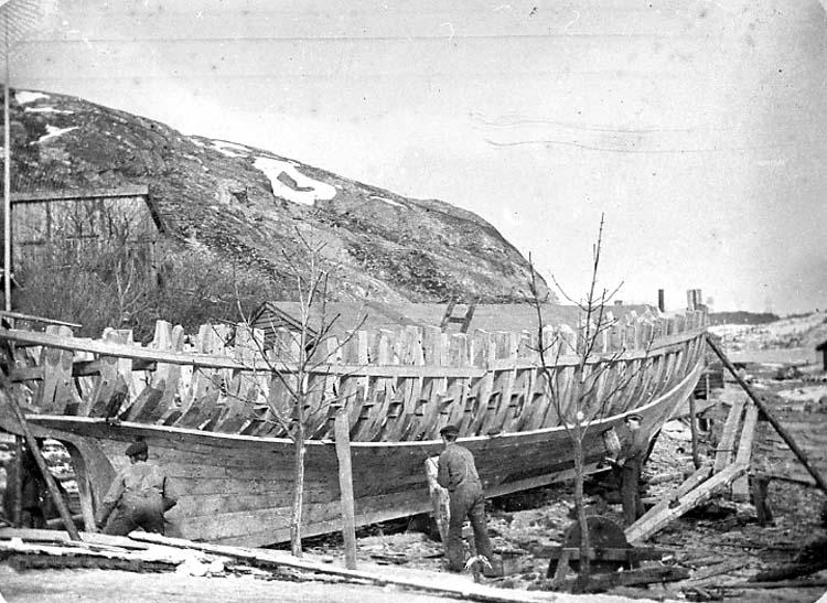 "Bogserbåt under byggnation vid Djupviks varv på Tjörn. Bilden tagen ca 1915."