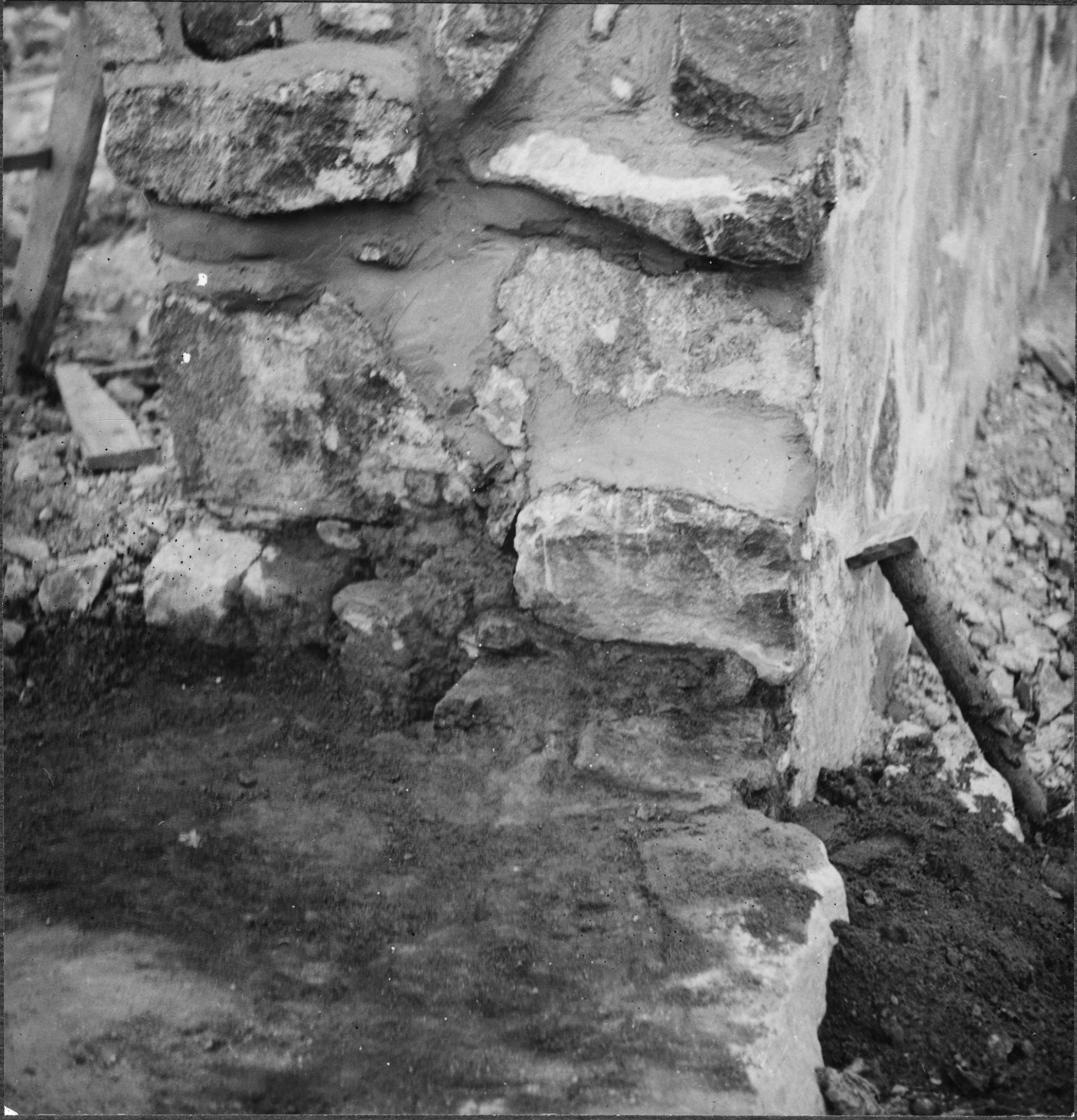 Långhusets sydvägg. Östra portalens västra kant med spår av tegel. Muren ovanför konserverad. Från Ö.