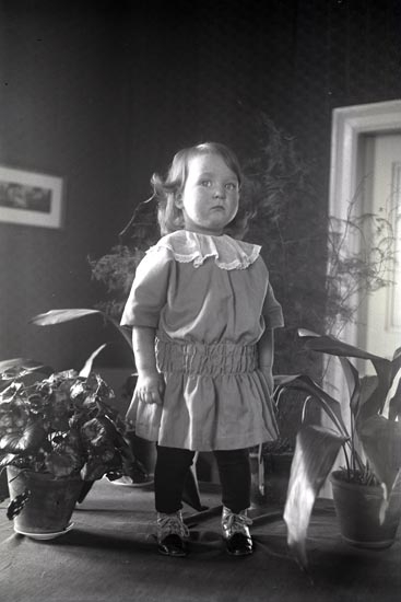 Margit Lysén porträtterad stående på ett bord bland gröna växter